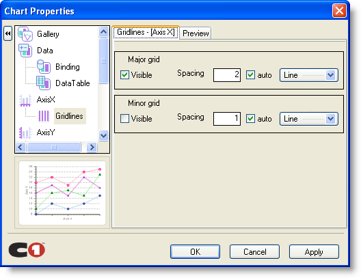 | Design-Time Tools for Creating 2D Charts > Working with the Chart Properties Designer > Axis X , Axis Y, and Axis Y2 Elements > Gridlines Tab |