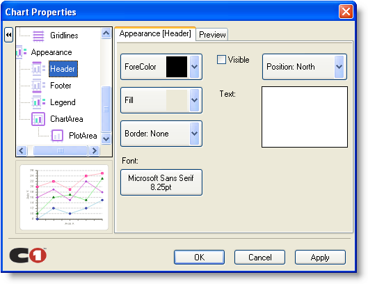 The Header tab contains the same properties as the Footer tab: ForeColor, Fill, Border, Font, Position, Visible, and Text.