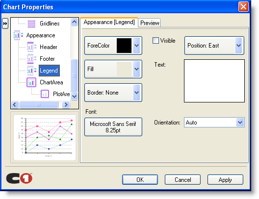 The Legend tab contains the same properties as the Header and Footer plus an additional Orientation property.