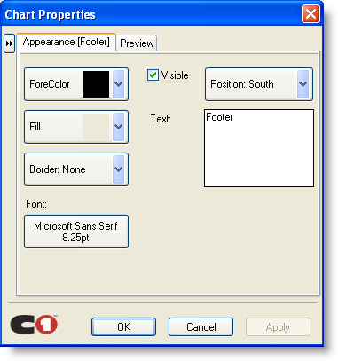 - Select the Properties button from the Footer's floating toolbar. The Appearance [Footer] properties appear in the Chart Properties editor.