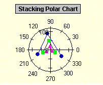 A Polar chart draws the x and y coordinates in each series as (theta,r), where theta is amount of rotation from the origin and r is the distance from the origin. Theta may be specified in either degrees (default) or radians. Since the X-axis is a circle, the X-axis maximum and minimum values are fixed. The series can be drawn independently, or stacked.