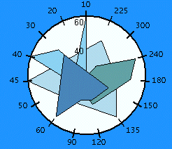 A Filled Radar chart draws the y value in each series along a radar line (the x value is ignored except for labels). If the data has n unique points, the chart plane is divided into n equal angle segments, and a radar line is drawn (representing each point) at n/360 degree increments. Each series is drawn "on top" of the preceding series. The series can be drawn independently or stacked. Filled Radar charts are the same as Radar charts, except that the area between the origin and the points is filled and symbols are not present. To create a Filled Radar chart, set theFilled property of the Radar class to True.