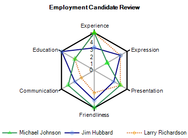 The Radar chart has special properties to chart the degrees of the Radar, set the starting angle, create filled radar chart.and whether or not to use flat Y coordinate gridlines for radar charts.