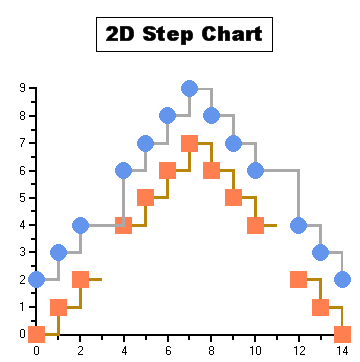 A Step chart is a form of a XY Plot chart. Step charts are often used when Y values change by discreet amounts, at specific values of X with a sudden change of value. A simple, everyday example would be a plot of a checkbook balance with time. As each deposit is made, and each check is written, the balance (Y value) of the check register changes suddenly, rather than gradually, as time passes (X value). During the time that no deposits are made, or checks written, the balance (Y value) remains constant as time passes.