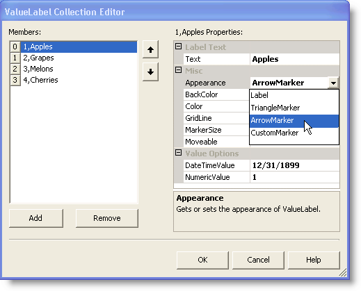 At design time you can set the label's appearance property by selecting one of the following label types: Label, Triangle Marker, ArrowMarker, or CustomMarker in the ValueLabel Collection Editor. The appearance property of the label class gets the value of the ValueLabelAppearanceEnum. At run time you can set the label's appearance property by using the following code: