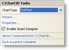 In Visual Studio 2005, the C1Chart3D control includes a smart tag. A smart tag represents a short-cut tasks menu that provides the most commonly used properties in each component/command.