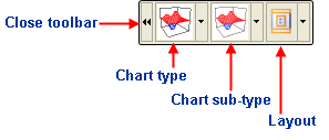 The primary C1Chart3D toolbar for the C1Chart3D control includes a close toolbar, chart type, chart sub-type, and layout button. The figure below provides a label for each of the command buttons in the C1Chart3D toolbar.