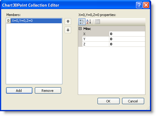 The Chart3DPoint Collection Editor allows the user to add or remove points for points in 3D space.