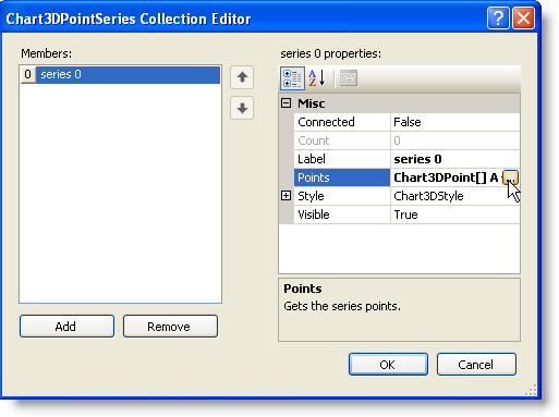 - Expand the Set node, then click on the ellipsis button next to the SeriesCollection property. The Chart3DPointSeries Collection Editor opens.