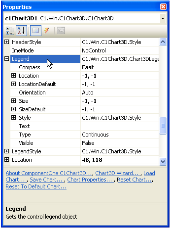 C1Chart3D1.Legend.Compass = CompassEnum.East C1Chart3D1.Legend.Style.Border.BorderStyle = BorderStyleEnum.Solid C1Chart3D1.Legend.Style.Border.Thickness = 3 C1Chart3D1.Legend.Style.Border.Color = Color.Black C1Chart3D1.Legend.Style.BackColor = Color.Gray C1Chart3D1.Legend.Text = "Legend Text" |