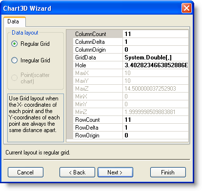 The next step in the chart wizard, you can select the type of data layout and then set up its Chart3DDataSetGrid properties. The Grid layout is used when the X-coordinates of each point and the Y-coordinates of each point are always the same distance apart. For more information about the Grid layout, see Grid Data Layout. The Irregular Grid layout is used when the X-coordinate of each point or the Y-coordinates of each point are not the same distance apart. Unlike Regular grids that use the ColumnDelta property, the Irregular Grid layout uses the ColumnDeltaArray property. For more information about the Irregular grid layout, see Irregular Grid Data Layout. The Point layout is used for scatter plots when you want to chart multiple series of points. When the Point layout is selected the Chart3DpointSeries Collection Editor is available to add or modify the series in the Chart3D Point chart type. For more information about the Point layout, see Point Data Layout.