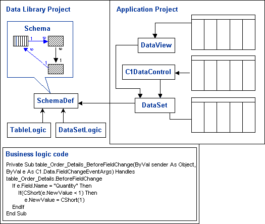 The client application fires business logic events in the data library. For example, when the end user modifies a field value in a grid, the C1DataSet component (to which the grid is bound with its DataSource/DataMember properties) calls the data library, and the BeforeFieldChange event is fired, handled by business logic code inside the data library.