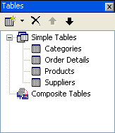 | Tables | The Tables window contains the list of all simple and composite table objects created by the Import Wizard based on the database tables. Double-clicking a table opens the Table Editor, where tables can be added and their properties specified.![]() For more information on creating and customizing tables, see Simple Tables or Composite Tables. |