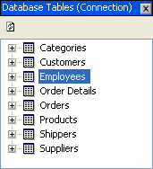 | Database tables | The Database Tables window contains a list of all the tables within the connected database. Change the database connection by clicking the Connect to database button and selecting a connection or creating a new one.![]() |