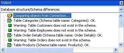 | Output | Select Verify schema from the Schema menu, and any errors in the schema are displayed in the Output window. Select Compare Schema with database structure from the Schema menu to scan the schema and database structure. Any differences between them appear in the Output window. Use the drop-down arrow to switch between the Verification and Database structure/Schema differences views.![]() For more information, see Database Structure Evolution and the Schema. |