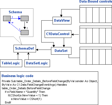 In a direct client application, a C1DataSet component resides on the same design surface with the C1SchemaDef component hosting the schema. A C1DataSet component must be attached directly to the C1SchemaDef component by setting its C1SchemaDef property (whereas in other configurations, a C1DataSet is attached to the data library instead, by setting its DataLibrary property). Data-bound GUI controls, such as grids, are attached to a C1DataSet either directly or indirectly (through C1DataView or C1DataTableSource), see How to Access Table View Data and How to Access Table Data.
