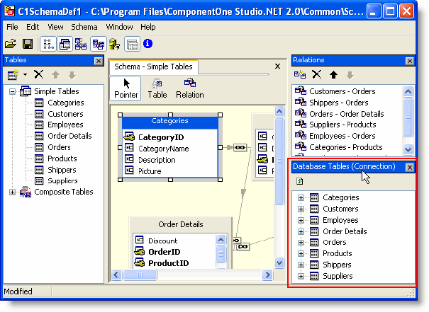 After you have imported the database structure, you can modify the schema, add tables (simple and composite), create relations, and so on. After import, the Schema Designer is connected to the database, so the Database Tables window is filled with the list of all database tables with their fields; this is highlighted in the image below: