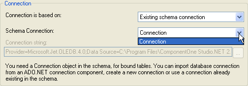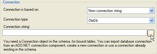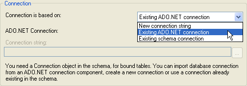 - In the first drop-down box, specify whether the Connection is based on: a new connection string, an existing ADO.NET connection or an existing schema connection.