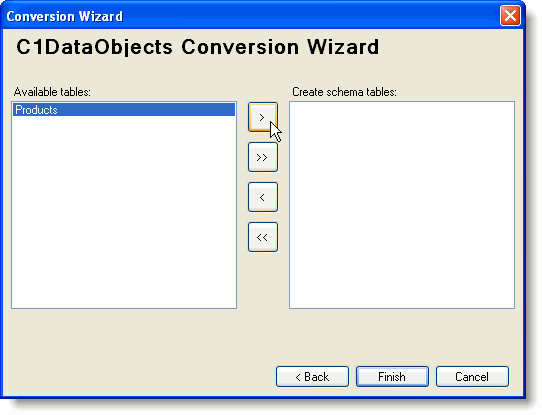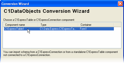 - If importing from DataObjects for .NET Express components, choose a C1ExpressConnection or C1ExpressTable component from the list of components.