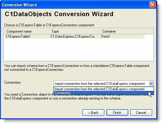 Note: If you are importing from DataObjects for .NET Express components, select Import connection from the selected C1DataExpress component or choose one of the other existing connections from the Connection drop-down box. |