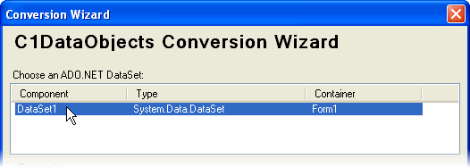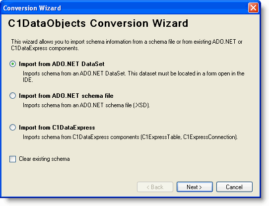 Note: The Connection section of the Conversion Wizard is the same if you are importing from an ADO.NET DataSet or schema file. If importing from an ADO.NET DataSet or schema file, follow the steps below. |