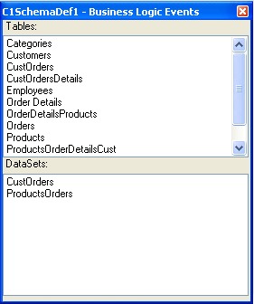 The Business Logic Events tool window shows the list of all tables and data sets. When you select a table in the tool window, the table's business logic events appear in the Properties window (in Visual C#, when the Events radio button is selected in the Properties window; in Visual Basic use the Method Name combo box in the code editor).