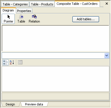 The Composite Table Editor opens when a new composite table is created. The editor has two tabs: Diagram and Properties. Using the Diagram tab, you can specify which simple tables are used in the composite table and how they are related.
