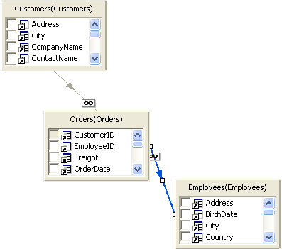- Select the Employees table and check the checkboxes for the following fields: FirstName and LastName. EmployeeID is not included for the same reason the CustomerID field was not included in the Orders table.