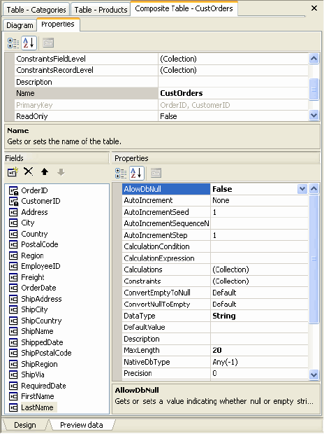 Note: To view all fields and their properties, select the Properties tab in the Composite Table Editor. Each field that was checked appears in the lower panel. |