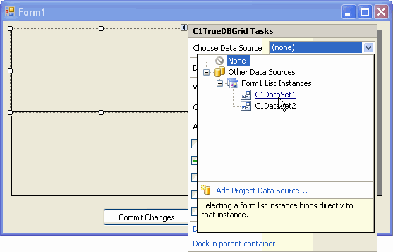 - Open the C1TrueDBGrid Tasks menu for C1TrueDBGrid2 and select C1DataSet1 under Choose DataSource.