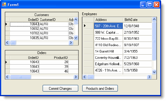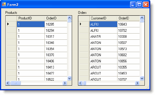 - Click Button2, the Products and Orders button. Form2 opens with two grids showing the two composite tables defined in the second data set of our schema, ProductsOrders.
