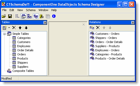 In the Schema Designer, the Tables window contains the list of all simple tables created by the Import Wizard based on the database tables. The Relations window contains inter-table relations created by the Import Wizard based on the relationships existing in the database.