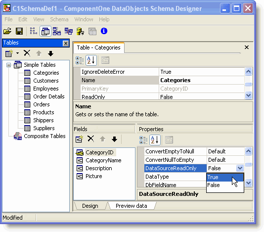 - In your project, set the SchemaDef property of C1DataSet1 and C1DataSet2 to SchemaDef1. This connects the data set components to the schema.