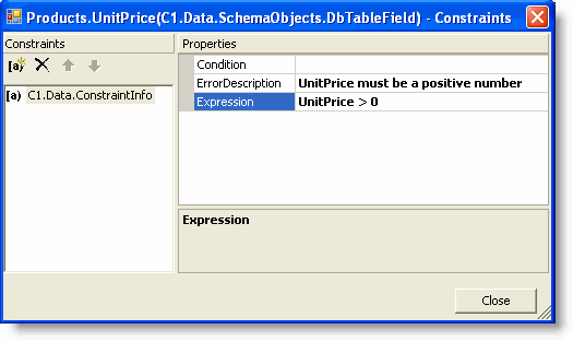 - Click Close. The constraint expression for the UnitPrice field of the Products table is specified, and now we will create several composite tables.
