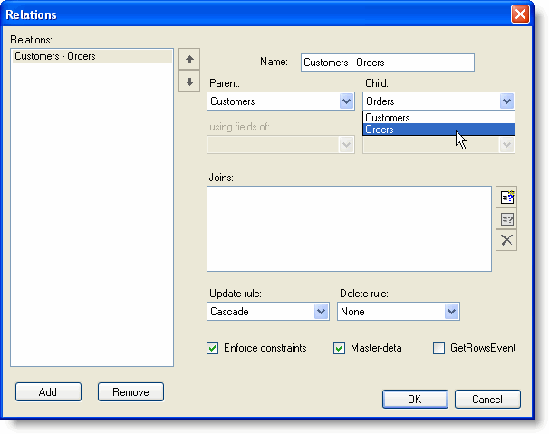 - Select Customers as the parent table and Orders as the child table in the Parent and Child drop-down lists.