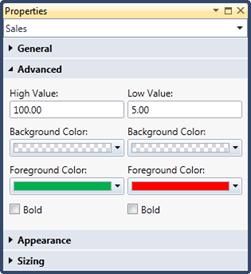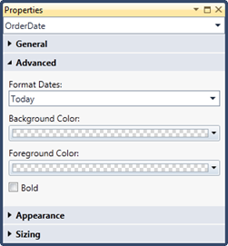 To set these properties, select FlexGrid Numeric Column or FlexGrid DateTime Column from the drop-down next to the appropriate field and view the Advanced group