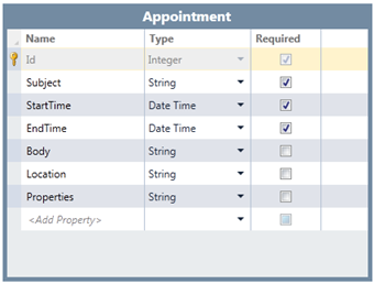 In this step, you will create a primary appointments data source that will be bound to the calendar screen to create a fully functional schedule. You will also create two additional tables: one to keep track of the sales people, who will become the contacts list, and one to keep track of information for the sales regions, which will become the resources list. Users will be able to use these lists to add contacts and resources to appointments in the schedule.