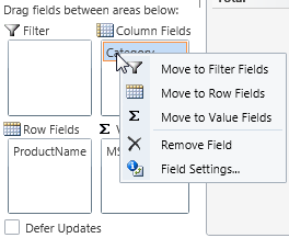If you right-click fields in the Filter, Column Fields, Row Fields, or Values area at run time, a context menu appears, allowing you to move the field to a different area. You can also remove the field or click Field Settings to format and apply a filter to the field.