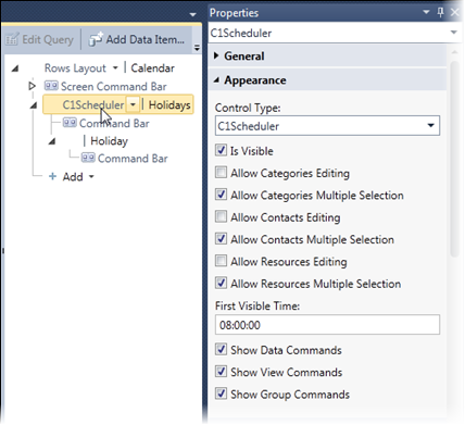 The C1Scheduler control exposes a small set of appearance properties that determine whether the attached data sources (if any) support editing and multiple selection. To set these properties, select C1Scheduler in the screen designer and view the Properties window.