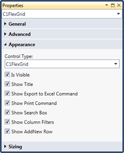 The Appearance group of the C1FlexGrid control includes check boxes that control the visibility of various UI elements at runtime, such as the title bar, export/print commands, search box, column filters, and the new row placeholder.