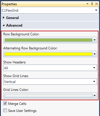 The Advanced group includes properties that can be used to change the default row colors and control the display of row/column headers and grid lines.