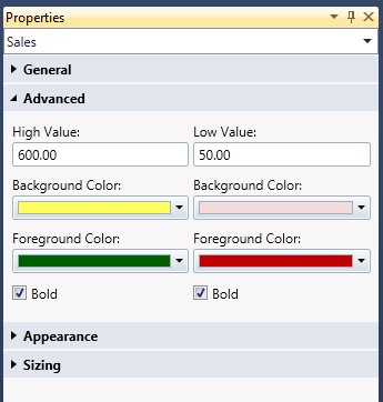 These sections discuss the design time properties available for the C1FlexGrid-specific elements in the screen designer. All of the C1FlexGrid options appear in the Advanced and Appearance groups; the General and Sizing groups contain only built-in Data Grid options.