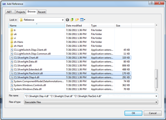 When the LightSwitch runtime has finished creating the control you specified in the call to FindControl, the ControlAvailable event will fire, and you will access the control within the handler for that event. But first, in order to refer to ComponentOne objects and access their properties, methods, and events, you will need to add references to the underlying Silverlight assemblies. On the Project menu, click Add Reference, and then click the Browse tab. Look in the following folder, relative to the LightSwitch project file (.lsproj):