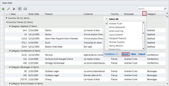 If the Show Column Filters property is enabled for a C1FlexGrid control, then the right edge of each column header includes a dropdown filter menu containing the unique values for that column. To filter the column, select the desired items, and then click Apply.