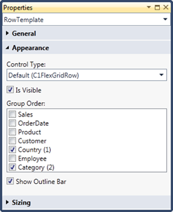 The Appearance group of the C1FlexGridRow placeholder element determines which columns (if any) are to be grouped at runtime. The order in which the columns are checked in the Group Order box determines the order of the runtime groups (the number of the column appears in parentheses). To redo the order, clear the items and then reselect them in the desired order.