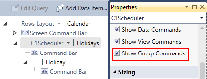 To make the Group items visible in the C1Scheduler toolbar at run time, check the Show Group Commands check box in the C1Scheduler Properties window.
