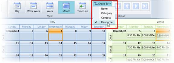 If you wanted to see which games are on NBC and which are on the Versus station, you could Group By Resource to view the schedules side-by-side and compare.