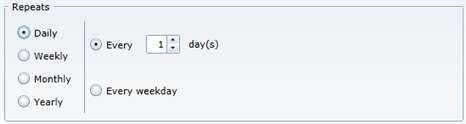 The Daily settings allow you to repeat an appointment every specified number of days or only on working days. For example, setting the appointment to every 2 day(s) will make the appointment appear every other day. Setting the appointment to on working days will make the appointment appear only Monday through Friday, by default. |