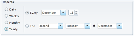 The Yearly setting allows you to repeat an appointment on a specified date or a specified day and week of a specified month. For example, setting the appointment to on the 2 day of January will make the appointment appear on January 2nd every year. This setting is ideal for birthdays and anniversaries. Setting the appointment to on the first Friday of January will make the appointment appear on the first Friday in January every year. |
