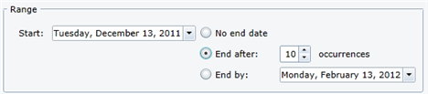The Start drop-down calendar allows you to select the date from which the recurrence will start. There are three options to choose from for an end date: